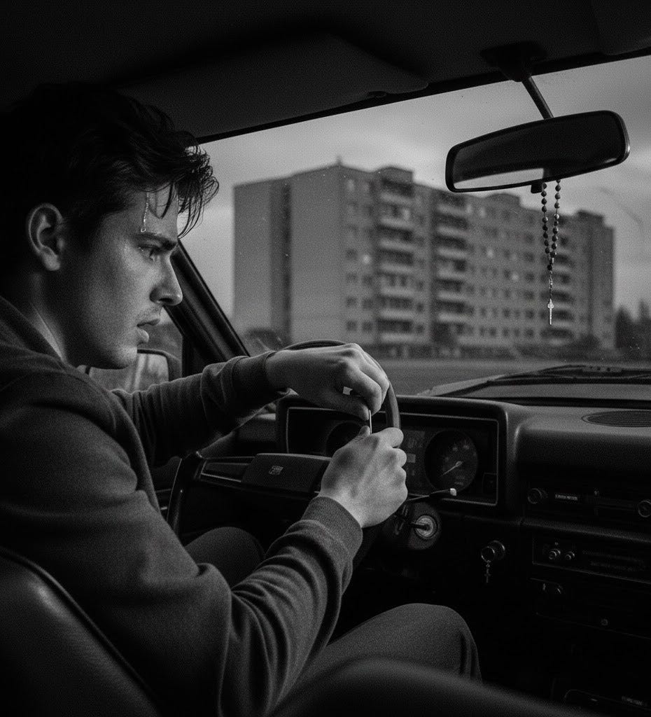 You turn the key again, and the car starts, while sweat drips from your forehead onto the seat. You closed your eyes, felt your eyelashes wet with sweat, and whispered softly: “Thank you.”